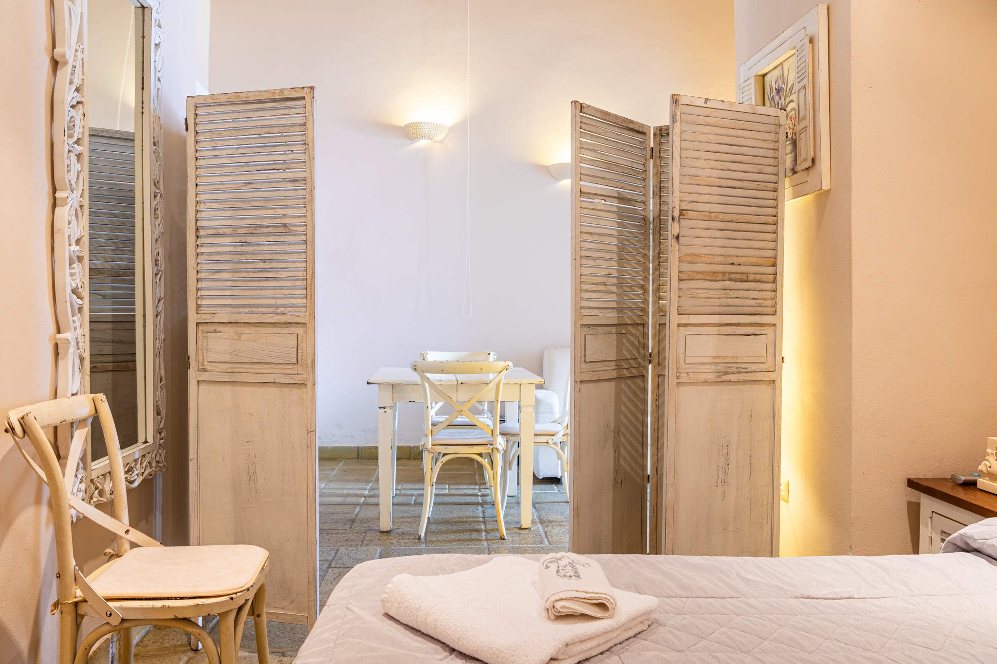 Le nostre camere presentano le principali caratteristiche delle abitazioni tipiche del centro storico di molti dei paesi salentini. Volte a stella e suggestivi lucernari lasciano immaginare ai nostri ospiti la vita autentica della gente che popolava e popola il cuore delle città e consentono di godere di un’ombra fresca e piacevole al ritorno dal mare e al riparo dal caldo sole estivo. Il bed & breakfast è dotato di unità climatizzate con armadio, cassaforte, TV a schermo piatto, terrazza e bagno privato con bidet. Alcune unità sono dotate di balcone e/o patio con vista sul mare e mobili da giardino. Nel bed and breakfast ogni unità dispone di biancheria da letto e da bagno.